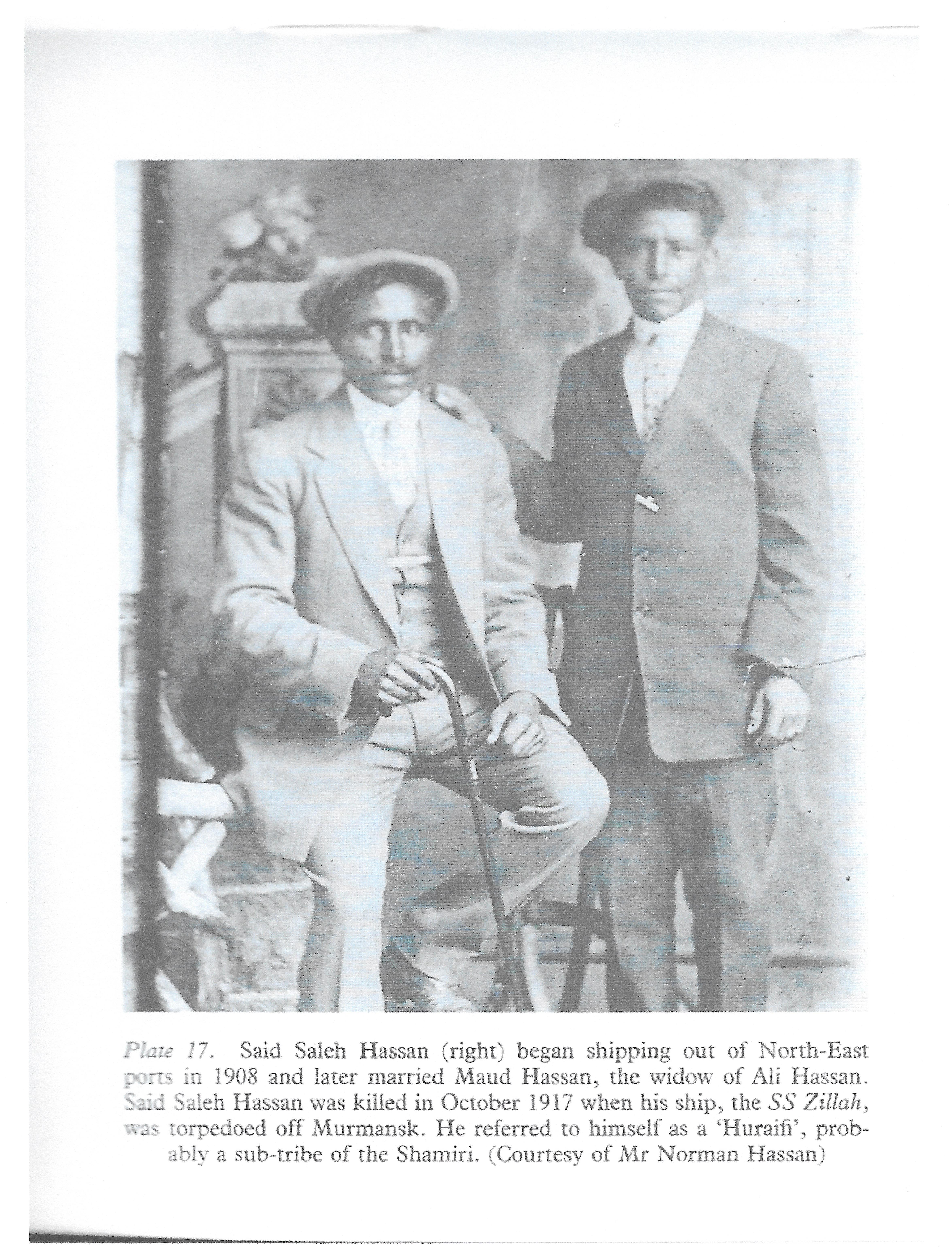 Said Saleh was a donkeyman on the SS Zillah, a 3,779 ton steam cargo ship. On 22 October 1917 she was en route from Archangel, in the allied Russian Empire, to the UK with a cargo of timber. She was sunk by a torpedo fired by German submarine U-46 approximately 25 nautical miles north-east of Kildin Island, in the Barents Sea off Murmansk. 18 men were lost, of whom 8 were Arab seamen. One was Said Saleh, whose last address was a lodging house in Cardiff. A month later the owners replied to a letter from his wife in South Shields that the lifeboat he was in was still missing. He and his Arab shipmates are recorded on the Memorial in Mumbai. His wife, previously married to Ali Hassan, who owned a boarding house, was born Maud Deans in South Shields. She had given birth two months before to a son, Norman, who, in the 1990s, would be a great help to researchers with family documents and information.